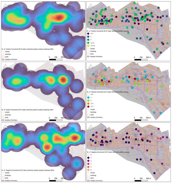 Results of the sentiment polarity analysis of Facebook posts and comments distributed on the map of Kaunas Center Eldership. Colors in the heatmaps represent the density of emotional responses, with warmer colors (red, orange) indicating areas of higher emotional intensity and cooler colors (blue, green) indicating lower intensity. Figures by the authors.