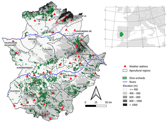 Extremadura is situated in the southwestern region of Spain, between latitudes 37°57′ and 40°29′ N and longitudes 4°39′ and 7°33′ W, with Portugal forming its western border (Figure 1). The region is comprised of two major provinces, Cáceres and Badajoz, which encompass 19,868 km2 and 21,766 km2, respectively. These two provinces are the largest in Spain. In terms of topographical characteristics, the region has an average elevation of 425 m above sea level (a.s.l.), with a maximum of 2091 m and a minimum of 116 m. The majority of the region’s surface area is situated within the Tajo and Guadiana river basins (Figure 1). The region of Extremadura has a total reservoir water capacity of 14,447 hm3, which represents 25.7% of the total capacity in Spain [56]. As a consequence of the precipitation levels observed during the current hydrological period (2023–2024), the region currently has 68.52% of its total water capacity in reservoirs [56,57], with a portion of this water being allocated for the irrigation of crops. The region boasts a rich rural heritage, with olive cultivation representing a significant economic activity. Olive cultivation occupies an area of 271,404 ha, representing 10.30% of the total area of Spain. It is the third autonomous community in terms of surface area dedicated to olive cultivation and olive oil production and the second in terms of table olives [58].