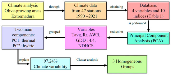 This study analyzed the climatic structure of Extremadura for olive cultivation, a large region in southwestern Spain with numerous olive-growing areas. Initially, fourteen bioclimatic indices were considered for the period 1990–2021, covering water and biothermal requirements.