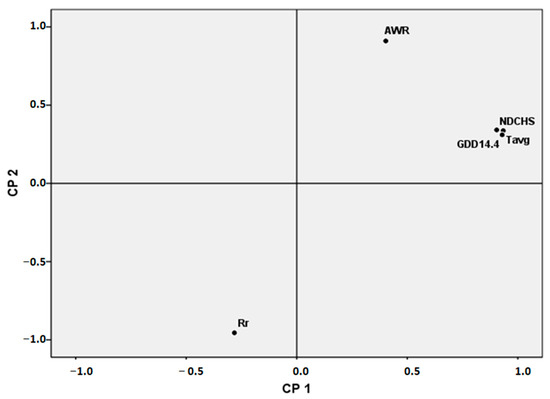 The result showed significant correlations between the bioclimatic indices, indicating that it was appropriate to perform a PCA to determine the main sources of variability in the data extracted from the weather stations. The results of the PCA (Table 4 and Figure 3) showed that the first two principal components explained 97.24% of the total variance, being 80.42% and 16.82% for principal component 1 (PC1) and principal component 2 (PC2), respectively. PC1 was mainly dominated by the three temperature-related indices (Tavg, GDD14.4, and NDCHS), with a small negative contribution of Rr and a positive median contribution of AWR, so it can be defined as a thermal component. PC2 is composed of the hydric variables, annual precipitation (Rr) and annual water requirement (AWR), with high negative and positive load contributions, respectively, and small negative contributions from the thermal bioclimatic indices. Therefore, component 2 (PC2) can be defined as the hydric component. Water variables were also part of the principal component in the study by Piñar-Fuentes et al. [80], in which they explained a large variability in olive tree production.