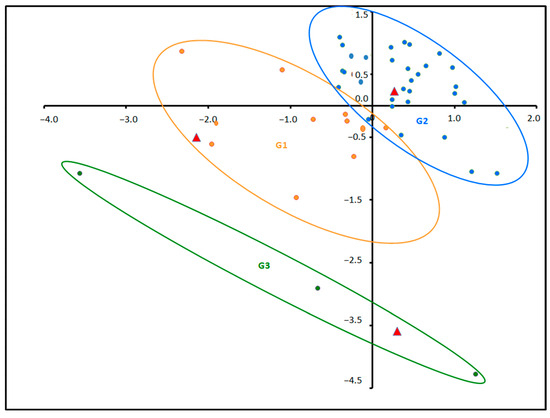 A principal component analysis (PCA) was performed to find the main sources of variability in the data from the weather stations. Homogeneous groups were determined by PC1 and PC2. Three bioclimatic clusters were defined. The centroids of each cluster and the location of the weather stations in relation to the two principal components are shown in Figure 4. Cluster G1 is characterized by an intermediate position in the components PC1 and PC2, and consequently, by average values in the bioclimatic and hydrological indices. The differences between the other two groups are determined in G3 by a higher rainfall and no annual water requirement and also by lower values in the biothermal indices. The G2 group obtains values close in some stations to those of the G1 group for the PC1 component; however, this group is defined by presenting high values in the PC1 component and obtaining in the PC2 component negative values in Rr and positive values in AWR. Consequently, it presents locations with a high deficit in the water requirement and in the annual rainfall.