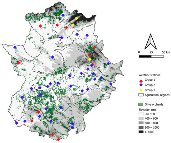 Distribution in Extremadura of the weather stations for the three climatic groups.