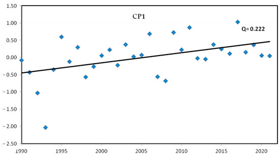 Mann–Kendall test statistic for principal components for the 47 weather stations in Extremadura for the period 1990–2021.