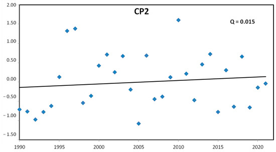 Figure 6 shows an increase in the seasonal mean values for the main component PC1 during the study period, with a positive slope value (Q = 0.222). Consequently, the thermal indices underwent an increase in the mean annual temperature (Tvag), the heat accumulating index (GDD14.4), and the NDCHS index in the growing season. In contrast, the component PC2 (Figure 7) has a positive slope but with a much lower value (Q = 0.015). Therefore, it can be deduced that in the studied period, there has been a decompensation between the annual water requirement of the olive tree, AWR, the annual precipitation Rr, and the increase in the crop water needs caused by the trend of the temperature-based indices (Tavg, GDD14.4, NDCHS), creating a cumulative annual water deficit over the 32 years of study.
