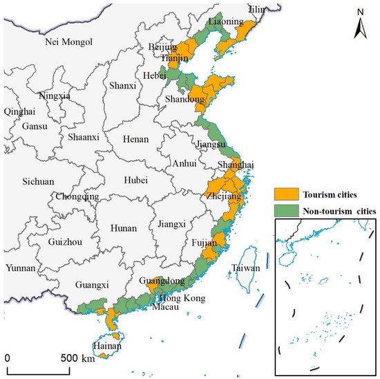 Considering the accessibility of data, this study selected 53 cities as the research subjects. By integrating data on the ratio of tourism revenue to regional gross domestic product, the number of tourist visits, and the quantity of A-level scenic spots, this paper categorized China’s coastal cities into tourism cities and non-tourism cities, with 25 tourism cities and 28 non-tourism cities (Figure 1).