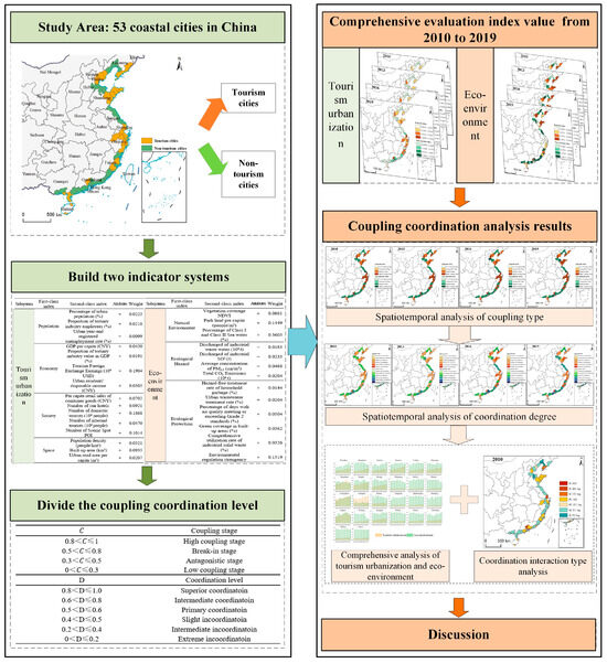 This study is divided into the following steps (Figure 2). The first step involves establishing the indicator systems for the tourism urbanization and ecological environment subsystems and then conducting dimensionless processing on the collected data from China’s coastal cities for the years 2010–2019. The second step employs the entropy method to objectively assign weights to each indicator, to calculate the composite indices for both the tourism urbanization subsystem and the ecological environment subsystem. The third step utilizes the coupling coordination model to compute the degree of coupling and coordination between tourism urbanization and the ecological environment, based on previous research and calculation outcomes, to categorize the levels of coupling and coordination for further analysis. The final step is to conduct spatiotemporal analysis on the calculation results and to delve into the discussion of the coordination and interactive types between tourism urbanization and the ecological environment.