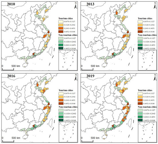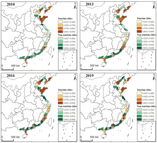 Spatial evolution trend of the comprehensive evaluation index of tourism urbanization in China’s coastal cities from 2010 to 2019.
