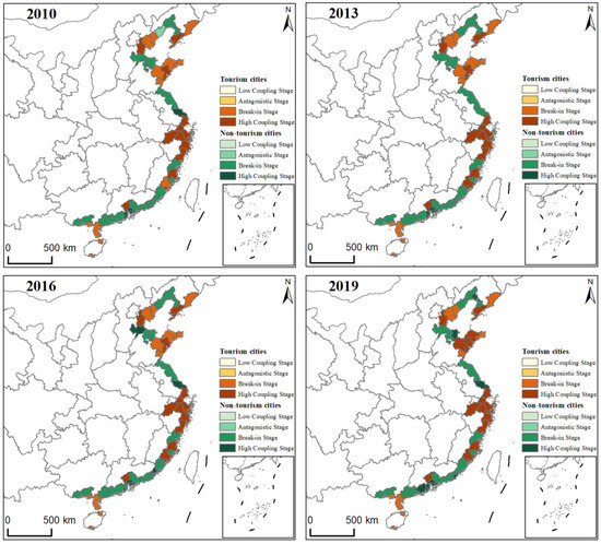The coupling degree between tourism urbanization and the ecological environment in China’s coastal cities has generally reached the break-in stage or higher, with no low-level coupling phenomena observed. Temporally scale, the coupling degree between tourism urbanization and the ecological environment has been increasing year by year. In 2010, the coupling degree of most cities was at the break-in stage, with only one city in the antagonism stage, and the proportion of high-level coupling cities was 34%. By 2019, the proportion of high-level coupling cities had reached 49%. Spatially, in 2010, cities in the Yangtze River Delta region had basically achieved a high level of coupling. With years of development, the core areas of the Pearl River Delta and cities on the Shandong Peninsula had also mostly reached a high-level coupling state. In addition, cities with more developed urban functions, such as Tianjin, Dalian, and Fuzhou, had also achieved high-level coupling (Figure 5).