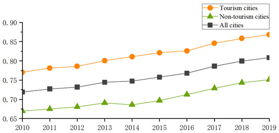 For tourism cities, in 2010, a total of 13 cities reached the high coupling stage, and by 2019, 17 cities had reached the high coupling stage. Zhanjiang, Beihai, Rizhao, Tangshan, Qinhuangdao, Dandong, Weihai, Haikou, and Sanya had not yet reached the high-level coupling stage by 2019. Specifically, the tourism urbanization process in these cities is slower and at a lower level compared to other cities, but their ecological environment performance is better than other tourism cities, which causes their coupling degree to lag behind other cities. For non-tourism cities, five cities reached the high coupling stage in 2010, with most cities in the break-in or antagonism stage; by 2019, nine cities had reached the high coupling stage, with the remaining cities basically at the antagonism stage. Tourism cities, due to their specific economic structure and policy support, are more likely to achieve high coupling, while non-tourism cities may lack the corresponding driving force and generally remain in the break-in stage. The average coupling degree of tourism cities is higher than that of non-tourism cities, with a difference ranging from 0.1008 to 0.1249 (Figure 6).