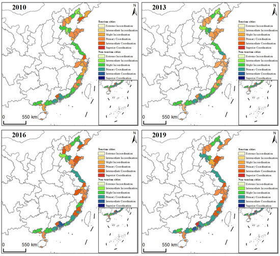 Coordination types of tourism urbanization and eco-environment in China’s coastal cities from 2010 to 2019.