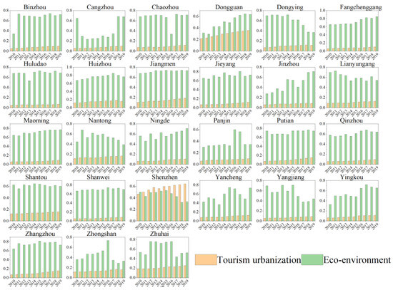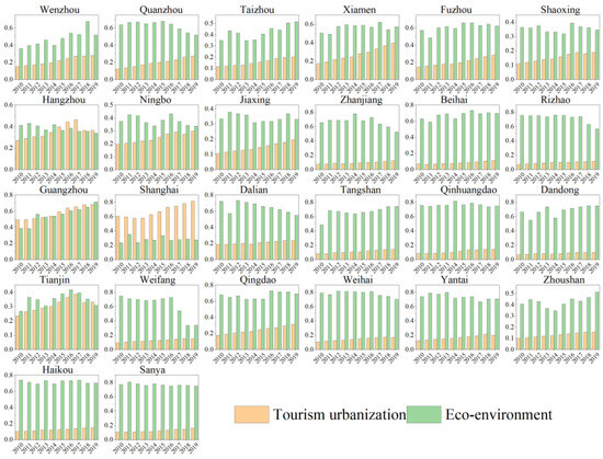 where represents the comprehensive value of the binhai tourism urbanization subsystem, and represents the comprehensive value of the ecological environment subsystem. and are the normalized values of the tourism urbanization indicators and eco-environment indicators, respectively, while and are the weights of the -th indicator. and reflect the development level of the subsystems, allowing for the analysis of the subsystems’ development trajectories over space and time; the higher the values, the higher the level of development.
