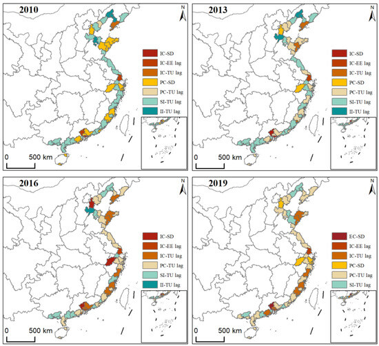 Based on the relative development index, each type of coordination can be divided into three categories: tourism urbanization lag (TU lag), ecological environment lag (EE lag), and synchronous development (SD). During the period from 2010 to 2019, the coordination level of most cities was mainly influenced by the level of tourism urbanization. As the situation of tourism urbanization lag gradually improved, its coordination level also gradually increased. In 2010, most cities were in the “SI-TU lag” state, and by 2019, most cities were in the “PC-TU lag” state (Figure 10). This indicates that the lag in tourism urbanization is an important reason affecting the coordination level between tourism urbanization and the ecological environment in most coastal cities. With the development of the tourism industry and urban construction, while maintaining a good ecological environment, the tourism urbanization and the ecological environment of coastal cities will further promote each other, and the coordination level will continue to rise. Shanghai has always been in the “IC-EE lag” state, Shenzhen has shifted from “IC-SD” to “IC-EE lag”, and Guangzhou has developed from “IC-EE lag” to “EC-SD”. The three major cities have different trajectories, with the ecological environment playing an important role in each. This indicates that for large, economically developed coastal tourism cities, the ecological environment plays a core role in urban sustainable development, and formulating and effectively implementing environmental policies are crucial for enhancing the coordination level of urban development [18]. In contrast, Tianjin and Hangzhou, although their ecological environment and tourism urbanization are also developing synchronously, only maintain a basic level of coordination. These cities can learn from the experiences of cities like Guangzhou to better promote the coordinated development of tourism urbanization and the ecological environment. The improvement of the coordination level between tourism urbanization and the ecological environment is a complex process that requires cities to consider comprehensively in terms of policy formulation, ecological environment protection, economic development, and other aspects.
