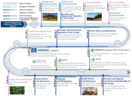 Parks for peace have been identified as being significant ecological, cultural, and eco-nomic areas, serving as a testament to ecological protection transcending political boundaries. The research conducted in China on the subject of parks for peace is still in its infancy. The extant literature on this subject is, for the most part, confined to the objective discussion of the historical development and status of foreign transboundary protected areas. The majority of relevant terminology is found in the context of biological protection when the concept was established. There is a paucity of in-depth research and a lack of systematic summary and analysis. Consequently, the present study employs a combination of case study and comparative analysis, selecting representative cases from across the globe, predominantly the inaugural parks for peace on each continent (Waterton-Glacier International Peace Park and Kgalagadi Transfrontier Park), which have a considerably longer history of development. These parks for peace have a more extended history of development and more experience and reference in park management, or they are representative examples of transboundary conservation on a regional scale or in terms of cultural value, such as the European Green Belt, Europe’s longest transboundary trail, containing six transfrontier parks. A systematized historical evolution of parks for peace, their current practices, and their application in the spatial relationship between different borders is recommended.