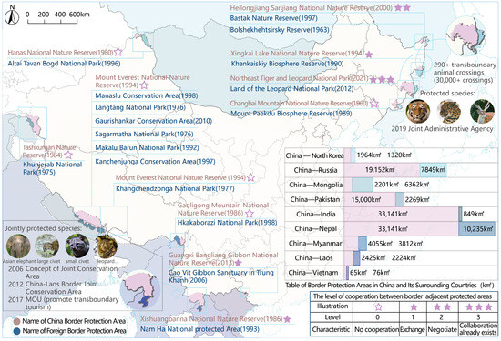 It is evident that China’s national parks already possess the fundamental prerequisites for transboundary collaboration. In 2019, China completed 10 trial areas of the national park system [26], of which the Northeast Tiger and Leopard Trial Area signed a memorandum of understanding on tiger and leopard conservation cooperation with Russia’s Land of the Leopard National Park [27]. In 2022, of the 49 candidate national parks in the National Park Spatial Arrangement Program, jointly issued by the State Forestry and Grassland Administration and other ministries and commissions, the area of reserves located along the Sino–Nepalese and Sino–Indian borders accounted for 70% of the total area of the candidate areas [28]. Currently, ten ecological reserves with a total area of more than 70,000 km2 have been constructed in China’s border areas, of which more than 35,000 km2 border nine other countries and have begun to implement different degrees of transboundary cooperation (Figure 5).