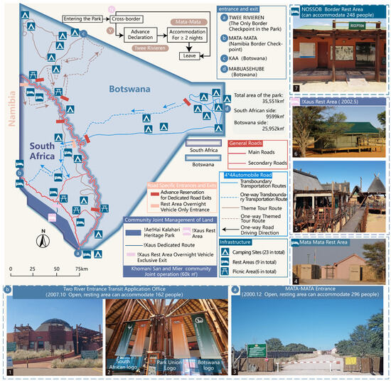 The development of parks for peace in Europe was limited by the contradictions and conflicts accumulated over time in border politics. By contrast, Africa is characterized by differences and divisions between regional cultural value systems. During the Iron Curtain period in Europe, the number of African countries rapidly increased from 80 to 193 [4], with tribes such as the Barwe, Ndau, and Shangaan in South Africa and Zimbabwe being affected by the conflict between the values of “racial diversity” and “national identity”. The conflict between the values of “ethnic diversity” and “national identity” has created new border divisions [5]. In the cultural context of African transboundary communities, transnational identity has been prioritized over national identity. This is not a conservation-inspired frontier narrative, but rather one where the fragility of the state has led to the formation of borders with “porous attributes” unique to Africa. However, the establishment of the Kgalagadi Transfrontier Park, the continent’s first park for peace, did not take place until 2000 (Figure 2).