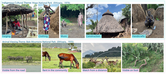The International Gorilla Conservation Program (IGCP) operates in Africa, partnering with the National Park Authorities of Uganda and Rwanda. It integrates economic opportunities for local communities with conservation goals. IGCP has started a revenue-sharing program that supports sustainable business ventures near gorilla habitats. Representatives of the local communities oversee the program in conjunction with government agents. These collaborative approaches, which were established following extensive dialog, have yielded distinct, new profitability, gradually detaching “nature conservation” from the attachment of “local livelihoods”. The involvement of local Indigenous people in the management of parks for peace, especially in the direction of recreation, has also resulted in the emergence of some main types of recreational themes in African national parks to meet the visitors’ image of the African frontier as “wild and untouched” (Figure 12). The efficacy of transboundary protected areas, or parks for peace, is derived from their capacity to align with overarching environmental agendas, and their articulation and implementation of these agendas, thereby metamorphosing transboundary protected areas into a distinct category of a park. To a certain extent, protected areas have transformed transboundary protected areas into alternative, healthier, and more sustainable boundary resources.