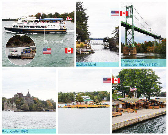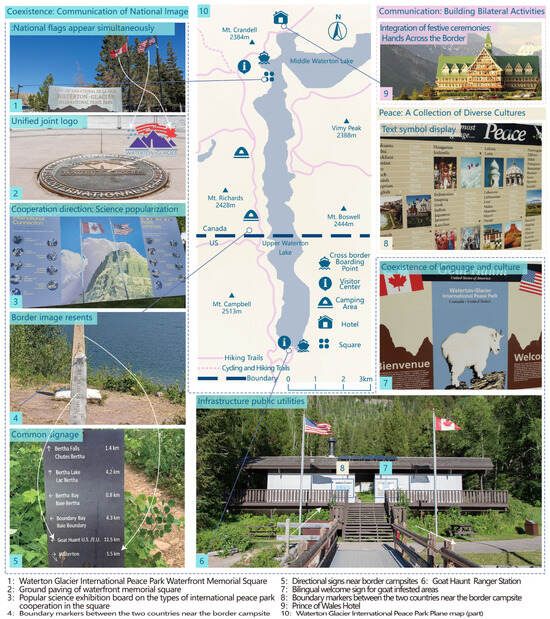 The Waterton-Glacier International Peace Park is notable for its retention of border monuments and signs along the national border, with the lakeside Entry Clearance Lodge (Goat Hunt Ranger Station) being carefully designed to blend into the landscape. This approach is evident in its subtle distinction from other vacation lodges when visited by boat, and the same could be said for the other lodges. The omnipresence of international peace park signs on both sides of the border further diminishes the border’s political significance, effectively relegating the recreational experience to the ongoing cooperation of the two nations (Figure 13). At the U.S.–Canada border, the parks for peace initiative has long transcended its nominal status, as evidenced by infrastructure such as a lake lodge in Canada’s Thousand Islands National Park. Despite not being designated as a park for peace site, this park exemplifies the commitment to the initiative and the U.S. national parks on the other side of the border. The presence of the flags of both countries serves as a metaphorical representation of peace, underscoring the ongoing efforts to maintain harmonious relations. Boats departing from one side of the park can access the island from the U.S. with a visa, and the Thousand Islands Bridge behind the park facilitates the movement of citizens between the two countries, thereby gradually eroding the distinct linear cartography of the border, which eventually dissolves into the expansive lake. In this context, parks for peace have evolved beyond governmental oversight, with the parks on both sides of the border electing to exhibit imagery that symbolizes cooperation and coexistence (Figure 14). Parks for peace, in this context, are places where the dissemination of national cultural intentions is no longer limited to national or governmental leadership but where parks on both sides of the border spontaneously choose to display imagery of cooperation and coexistence.