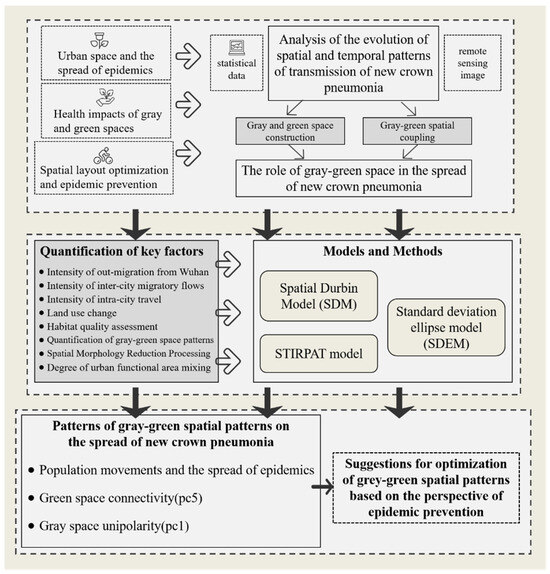 The aim of this study is to investigate the spatial spillover effects of urban gray–green spatial patterns on the spread of COVID-19. To this end, this study adopted an integrated spatial analysis approach. First, the gray–green spatial patterns of the city were quantified by landscape pattern indexes, and several related indicators were downscaled using principal component analysis (PCA), from which seven main components were extracted to comprehensively characterize the structural features of the urban gray–green spaces. Subsequently, the relationship between these gray–green spatial features and the spread of the epidemic was analyzed using the spatial Durbin model (SDM), especially their direct impact on the local epidemic spread and the spatial spillover effect to neighboring areas. To further explore the drivers of epidemic spread, this study also combined multidimensional variables such as ecological, socio-economic, and population mobility to comprehensively assess the role of these factors in epidemic spread. In addition, through the global Moran index and local spatial autocorrelation analyses, we have deeply explored the spatial distribution characteristics of the epidemic spread. The operational workflow is illustrated in Figure 1.