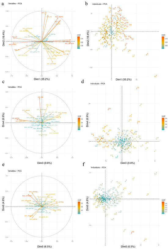 Variable contribution of principal components pc1–pc6 and individual role scatterplot. Note: (a,b) variable contribution of principal components pc1–pc2 and individual role scatterplot, (c,d) variable contribution of principal components pc3–pc4 and individual role scatterplot, (e,f) variable contribution of principal components pc5–pc6 and individual role scatterplot.