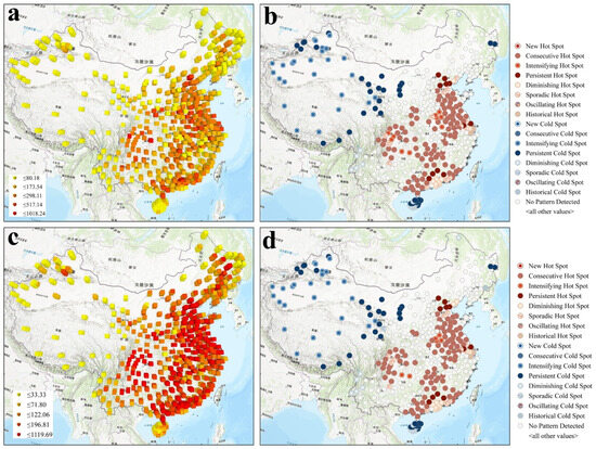 (a) Trend analysis of spatial and temporal distribution of emigrants and (b) analysis of emerging spatio-temporal hotspots of emigrants from 10 January to 23 January. (c) Trend analysis of spatial and temporal distribution of emigrants and (d) analysis of emerging spatio-temporal hotspots of emigrants from 8 February to 22 February.