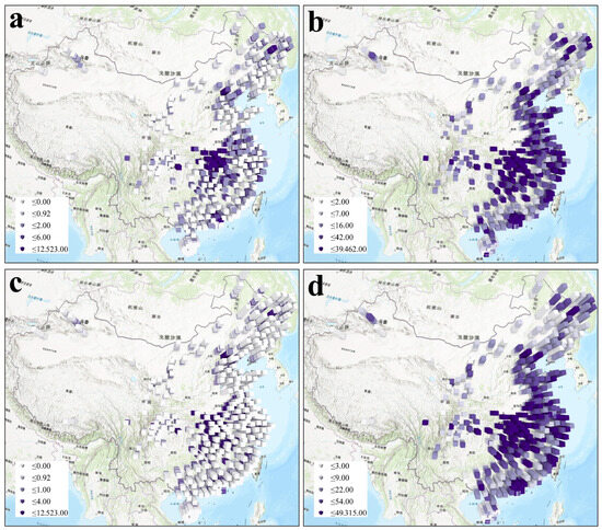 During the control and recession phase (23 February–1 March), spatio-temporal cube modeling reveals a clear trend of rapidly decreasing daily new confirmed cases (Figure 5c). Most cities shifted to a white color, indicating minimal new cases, with the exception of Hong Kong, which remains marked in blue. This suggests that the outbreak was largely controlled. The cumulative number of confirmed cases also mirrors this trend, with the spatial distribution reflecting the phase of control (Figure 5d). High-incidence areas were primarily located in Hubei Province and its surrounding regions. Notably, some northeastern areas, such as northern Heilongjiang Province, also exhibited relatively high incidence rates. Conversely, Inner Mongolia and much of Guizhou experienced lower prevalence rates. Overall, the highest COVID-19 prevalence was concentrated around Wuhan, along the southeastern coast, and in parts of northeastern China. In contrast, northern cities and western inland areas showed generally lower infection rates compared to the southeastern coastal regions.