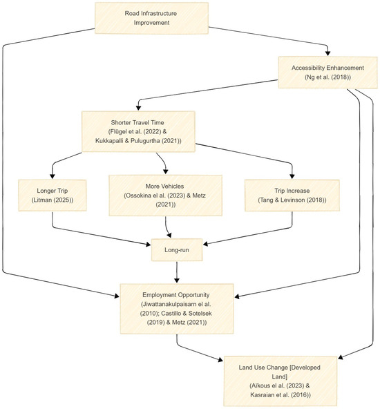 In the physical world, the transportation network is the backbone of social development and land use expansion [1,2,3]. Transportation systems and land use co-exist and influence the landform. So, any land-use changes alter travel behavior and demand, influencing vehicle flows and road infrastructure. Furthermore, vehicle flows drive the construction and improvement of road network facilities. Finally, improved and new transportation infrastructure enhances accessibility and mobility patterns, leading to the relocation of socioeconomic activities and land use [4,5]. Most of the time, the governments take different public policies to road improvements and development to support integration, connect various functional areas and administrative regions, aggregation of logistics, energy, information, capital, and other flows [6]. For example, in the USA, the Interstate Highway System, a network of controlled-access highways that forms a part of the National Highway System of the United States, was introduced to support national security and facilitate interstate travel and commerce [7]. Although road construction and improvement, which includes activities such as widening, resurfacing, and adding new lanes or features to existing roads, can be carried out for several purposes, they can also lead to economic development [8,9,10,11]. Diaconu et al. [12] observed that new highway infrastructure in Romania led to substantial land use change, replacing agricultural land with industrial and built-up areas. Similarly, Aïkous et al. [13] demonstrated that highway expansion in Montreal significantly increased the probability of industrial and commercial construction near a new access ramp.