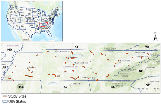 Tennessee is located in the southeastern United States. Its diverse geography ranges from the Appalachian Mountains in the east to the rolling plains of Middle and West Tennessee. This diversity influences transportation networks, land development patterns, and urban growth dynamics. The state has well-developed transportation networks, including major interstate highways such as I-40, I-24, and I-75, which facilitate regional connectivity. This study comprises 84 road improvement projects throughout Tennessee (Figure 2).