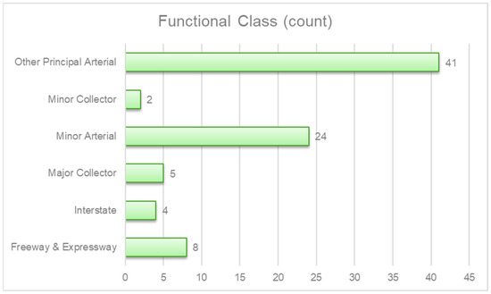 Additionally, data were also collected from the TN-TIMES on the functional road classification and whether the road project is in a rural or urban area. Figure 3 illustrates a distribution of study sites by their functional class. This study utilized data from 10 years preceding and following project completion for analysis. For example, if a road project was completed in 2010, this study used data from 2000 to 2009 for the pre-project implementation period and from 2011 to 2020 for the post-project implementation period. This study excluded the year of completion from the analysis.
