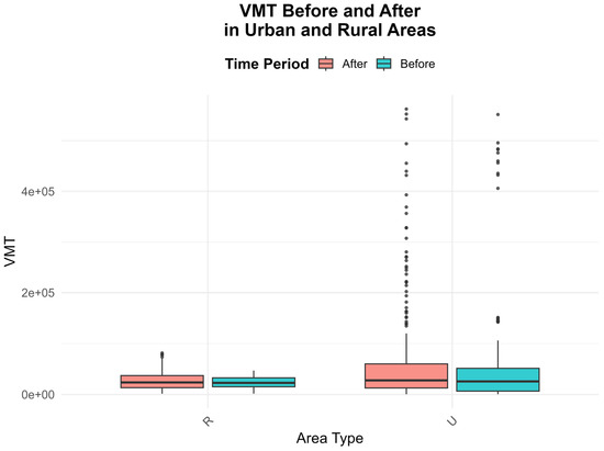 The boxplot shown in Figure 4 indicates that urban areas (labeled as U and rural areas are labeled as R) exhibit more significant variation and higher VMT levels compared to rural areas over the pre- and post-project implementation periods (also referred to as before and after period, respectively). While the differences in VMT before and after are not particularly substantial, there are noteworthy variations in the distribution (see Figure 4). Both urban and rural areas exhibit comparable median VMT values before and after, although urban areas display a broader distribution.