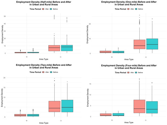 This study utilized the United States Census Bureau “OnTheMap” web service to collect employment data, which uses 2-digit NAICS codes to categorize industries into classes. The employment data from 2002 to 2022 was sourced from the website as point features, and the total number of jobs was calculated by summing all NAICS categories. Subsequently, the employment data was spatially joined and integrated with each buffer, allowing for the calculation of employment density in each buffer area by dividing the total employment by the buffer area. Figure 6 illustrates the employment density before and after the road improvement project across various rural and urban buffer areas in Tennessee. This figure provides a comparative overview of employment density across urban and rural regions. Urban areas (U) consistently display higher employment density throughout all buffer scenarios during the periods of before and after road improvement than rural areas (R), with a more pronounced interquartile range and median values. In contrast, rural areas show relatively low employment density, with minimal variation between the periods before and after the improvements.