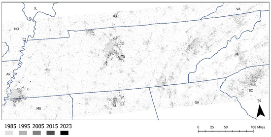 Following reclassification, land cover data were clipped to half-, one-, two-, and four-mile buffers around each study site. Development density was then calculated by determining the number of pixels classified as “Developed.” Since the NLCD dataset has a 30-m resolution, each pixel represents 900 square meters (30 m × 30 m). The total number of developed pixels was multiplied by 900 square meters and converted to square miles to estimate the developed area within each buffer zone. Finally, development density was computed by dividing the total developed area by the respective buffer area. Figure 7 shows the urban growth in Tennessee from 1985 to 2023.