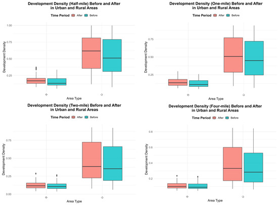 In urban areas, a notable increase in development density is observed after construction, as evidenced by the shifts in the median and interquartile range depicted in the boxplots (see Figure 8). Conversely, development density in rural areas remains relatively stable, with only slight variations in both the median and whisker ranges. The buffer zones of half a mile and one mile exhibit the most significant differences in development density within urban settings. In contrast, development density patterns illustrate a broader spatial dispersion effect at larger buffer zones of two and four miles. However, urban areas continue to experience more substantial growth compared to their rural counterparts.