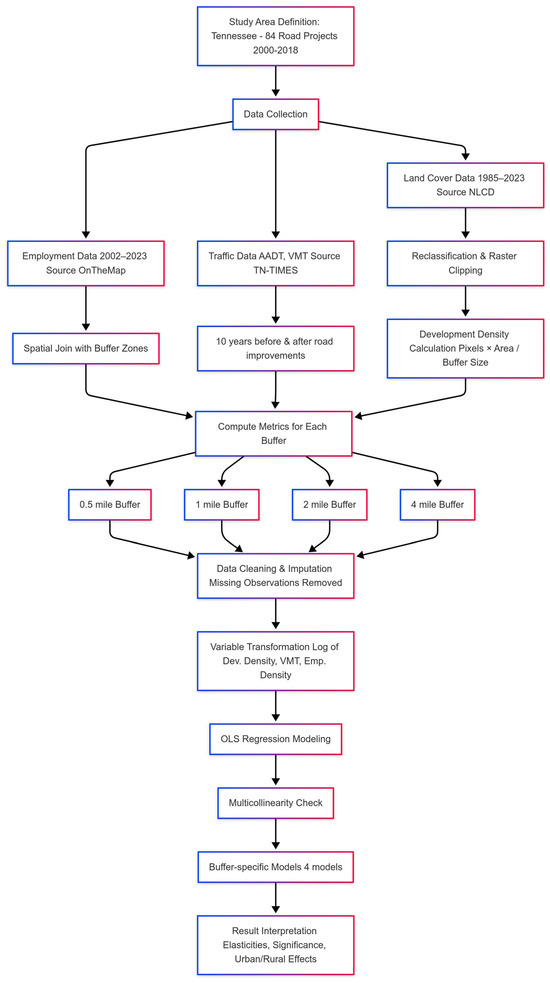 We utilize real-time traffic data collected before and after the construction of road improvement or development projects and integrate it with employment data in developing a model to estimate the impact of developed land changes in rural and urban areas of Tennessee. The conceptual framework is presented in Figure 1. Additionally, this research aimed to connect the physical dimensions of transportation infrastructure with the developing metaverse technology, which could redefine this concept by offering experiences in virtual environments. Metaverse technology continuously involves and mixes with various aspects of our day-to-day lives, which makes it extremely important to explore its potential for integration into real-world transportation [31,32,33]. This research examines the case studies of Tennessee road improvement and its relation with developed land growth to provide a comprehensive understanding of the potential challenges and opportunities in emerging virtual real estate.