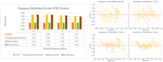 Table 2 displays the descriptive statistics of the dependent and explanatory variables. The descriptive statistics indicate that as the distance from the road network increases, development and employment density decrease. An OLS model was performed for each buffer distance to analyze the relationship between the road network and development activities further. To check the model reliability, we test the multicollinearity and heteroskedasticity. Figure 10 shows the VIF scores of variables and a plot of residual vs. fitted values. VIF scores for all the variables in all models are below 5, indicating no multicollinearity concern. Regarding heteroskedasticity, the plot of the residual vs. fitted values for the half-mile buffer reveals mild heteroskedasticity. However, with increasing buffer distance, the variance becomes more homogeneous.