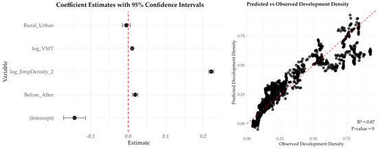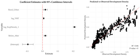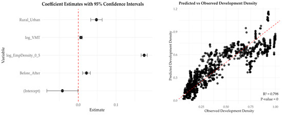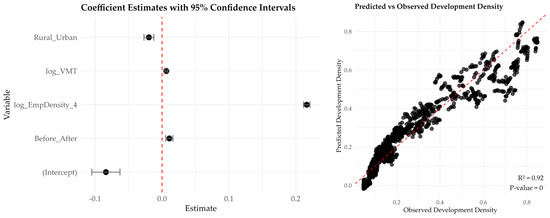 Employment density remains the most significant predictor, with a one-unit increase resulting in a 22.16% increase in development density (see Table 8). This effect size is slightly greater than that observed in smaller buffer models, indicating that employment-driven urbanization is more pronounced at larger spatial scales. In contrast to smaller buffer models, the influence of VMT shows a slight increase, suggesting that enhanced mobility accessibility plays a more crucial role in development at larger scales. Furthermore, unlike in the smaller buffer models, rural-urban classification is no longer statistically significant (p > 0.05). Figure 13 displays the coefficient plot and predicted vs observed plot, where red line for coefficient indicates the null effect and in predicted vs observed plot 45 degree red line representing the model fit line.