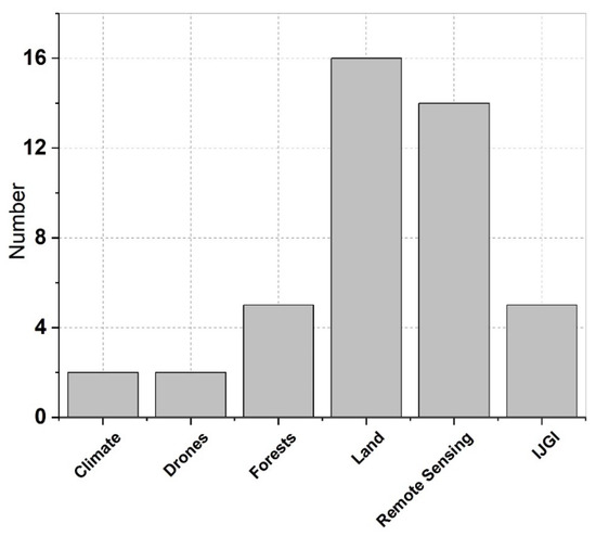 With regard to paper distribution by journal, “Land” has the largest number, with 16 papers, followed by “Remote Sensing”, with 14 papers. Both “Climate” and “Drones” received the lowest number, with two papers each (Figure 1).