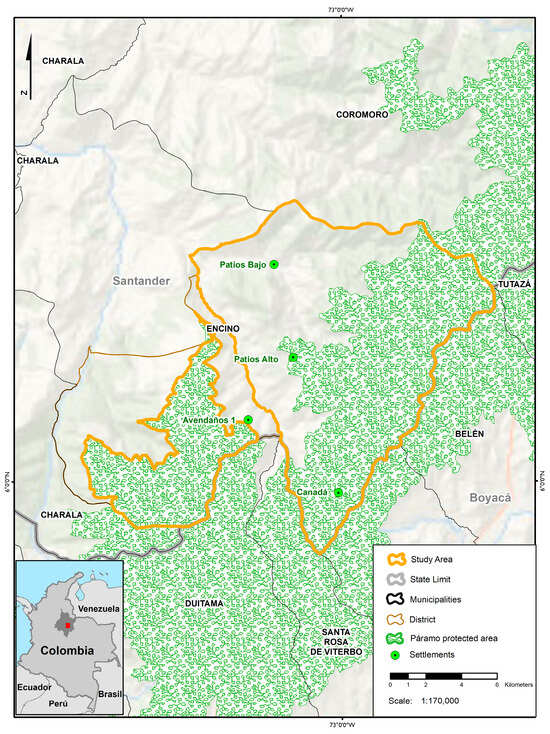 Páramo ecosystems are localized at high latitudes and considered strategic areas for the conservation of ecosystem services and biodiversity. Regulation of water resources, carbon sequestration, and the protection of unique flora species are among their crucial functions, essential for the provisioning of ecosystem services. They contain 10% of Colombia’s biodiversity with endemic species of plants, mammals, birds, and amphibians []. In addition, these ecosystems have been the livelihood of a sizable number of families who benefit from the water for their consumption and agricultural and livestock activities. The study area is located within the buffer zone of the Guantiva-La Rusia complex, which supplies 87% of the water of the 22 municipalities that border the complex (Figure 1) [].