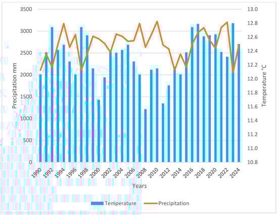 Average annual precipitation and temperature variation from 1990 to 2024 in the study area.