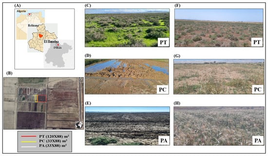 (A,B) Geographical location of the experimental plots. (C–E) Plots in the wet period (December 2021). (F–H) Plots in the dry period before harvest (May 2022).