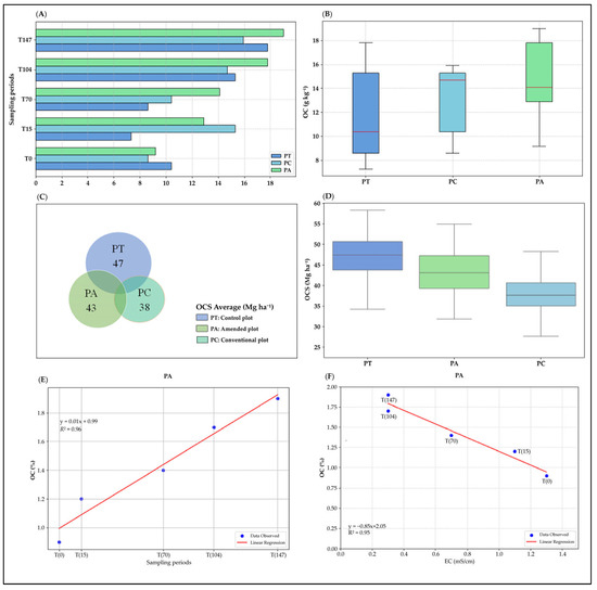 (A) Variation of soil OC at each sampling stage. (B) Difference of soil OC variation among plots. (C) Variation in average of soil OCS. (D) Boxplots for difference of OCS variation. (E) Linear regression between sampling periods and OC values for PA. (F) Linear regression between EC and OC for PA. PT: control plot, PC: conventional plot, PA: amended plot.