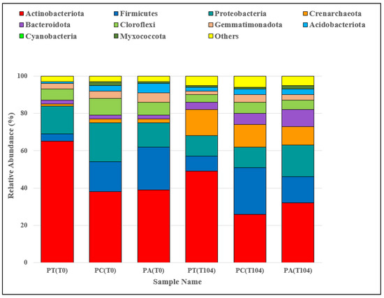 Regarding the domain distribution, more than 98% of OTUs at T(0) were classified within the Bacteria domain, while only 2% were affiliated with the Archaea domain. At T(104), the proportion of Archaea increased to 12%, while the Bacteria domain represented 88% of the OTUs. The detailed summary of the tag counts and OTU numbers for each sample at both T(0) and T(104) is provided in Figure S4, which also highlights the distribution of sequencing effort and OTU richness across the PT (control), PC and PA plots.