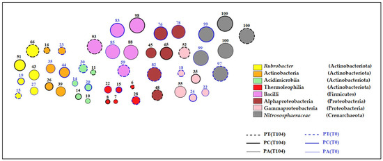 Figure 4 provides more details on the microbial structure of the four most abundant phyla. The OTUs with the highest indicator values for soils from the three plots at T(0) and T(104) were dominated by the phylum Actinobacteriota with the genus Rubrobacter and the classes Actinobacteria, Acidimicrobiia and Thermoleophilia. Then came the Firmicutes with the class Bacilli, followed by the Proteobacteria, with the classes Alphaproteobacteria and Gammaproteobacteria. Archaea are dominated by the Crenarchaeota, notably the Nitrososphaeraceae family.