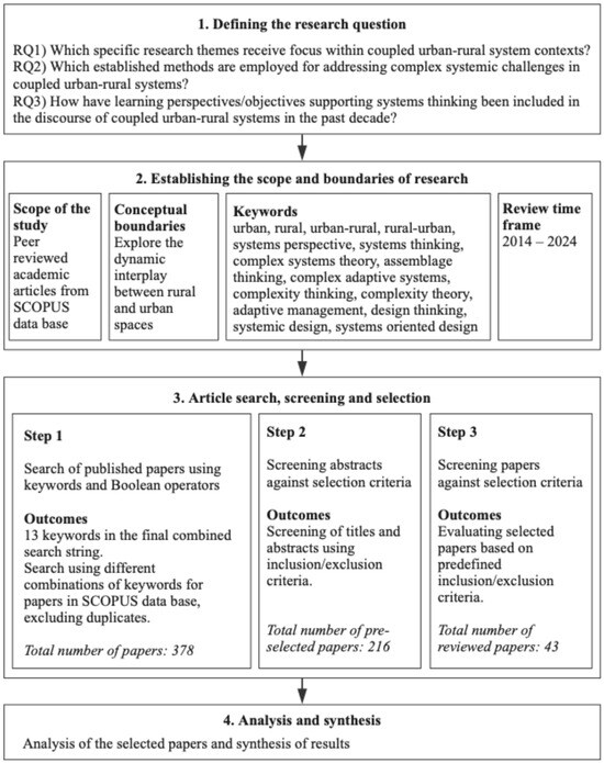 The review scope is articles published between 2014 and 2024. The decision to set the year 2014 as a starting point is based on the interest in exploring contemporary approaches to research of rural and urban systems, increasing rates of globalization, impact of climate change, boosting technological development, digital transformation, and other factors.