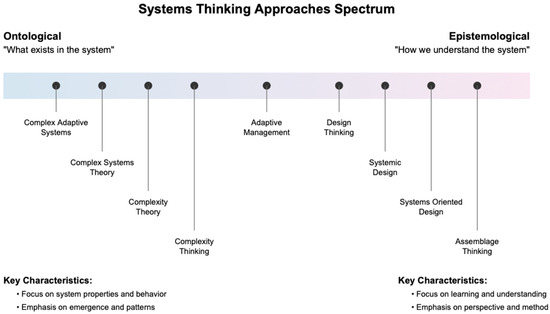 Systems thinking approaches included in this review. The figure represents an example of their potential applications across the ontological–epistemological spectrum.