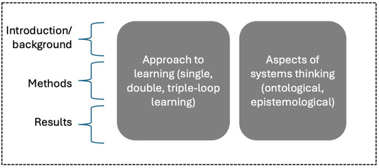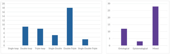 Next, the concept of triple-loop learning, from organizational learning theory, was chosen to provide structure and rigor to the analysis as it relates to research question 3. Single-loop learning focuses on improving existing practices within accepted frameworks—aligning with ontological systems approaches that describe system properties [14,53]. Double-loop learning questions underlying assumptions and goals [17,54]—resonating with epistemological systems approaches that examine how we understand and study systems. Triple-loop learning ventures further by questioning the context itself and transforming the learner’s perspective [55]—closely aligning with reflexive approaches in systems thinking such as systemic design and adaptive management [44,48].