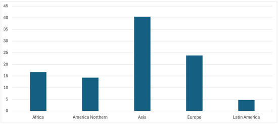 The analyzed papers cover urban and rural synergies with a global geographical distribution. Most papers have their geographic focus in Asia (40%), followed by Europe (24%), then Africa (17%), Northern America (14%), and, finally, Latin America (5%) (see Figure 5).