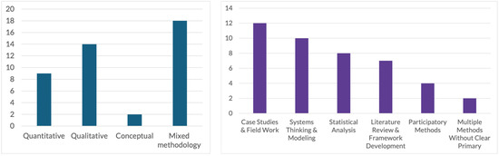 Systems thinking and modeling approaches appear in 23% of the papers (n = 10), often combined with empirical methods such as case studies (28%, n = 12) and statistical analysis (19%, n = 8) (see Figure 6). The use of participatory methods is less common (9%, n = 4).