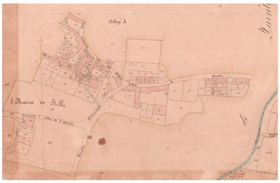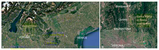 The Valpantena is an alluvial valley that connects the city of Verona with the Lessini Mountains. According to some, its name, Valpantena, derives from the presence of the Pantheon located in Santa Maria in Stelle since Roman times; according to others, its name is of Etruscan origin []. Regardless of the etymology of its name, this valley has always been an important element in the territory of connection between the city and the mountains and its human occupation has been proven since the Palaeolithic age []. The villages of Santa Maria in Stelle and Vendri, located in the southern part of the Valpantena a few kilometres from the city of Verona, were most probably inhabited in Roman times when the hypogeum was built to collect and canalise water to an existing villa in the area or for the use of the local population []. The survival of these settlements over time is reflected in maps from the 15th century onwards, such as the Almagià map [], as well as in all subsequent maps (Figure 2). The proximity of these settlements, the presence of the water that comes down from the mountain, the sweet hill environment and the fertility of the land were perhaps the factors that consolidated this area so that some important families of Verona had already established their properties and their place of rest and villeggiatura here from the 15th century onwards.