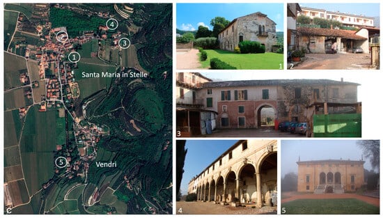 The village of Santa Maria in Stelle, located in the Valpantena, just a few kilometres from Verona (Italy), is known for its hypogeum from Roman times (dated between the 1st and 3rd century AD) and early Christian times, built to protect a natural spring that gushed out in the place where the village church now stands. In early Christian times, the hypogeum was used as the first baptismal font []. From the mid-15th century onwards and in relation to the transformation of the territory and its management, five villas were settled in Santa Maria in Stelle and the nearby hamlet called Vendri, representing a clear and relevant example for understanding the transformations that occurred in villa architecture in the mainland territories and in the province of Verona within the phenomenon of occupation and management of the territory developed by the Republic of Venice [,,,].