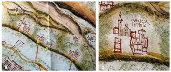 Almagia Map, 1460 (Lodi e Varanini, 2014): (a) Detail of part of the Valpantena. In order, from left to right on the centre line: Romagnano (1), Santa Maria in Stelle (2), Vendri (3), Nesente (4), Novoglie (5). (b) Detail of the representation of Santa Maria in Stelle.